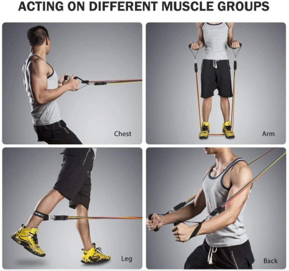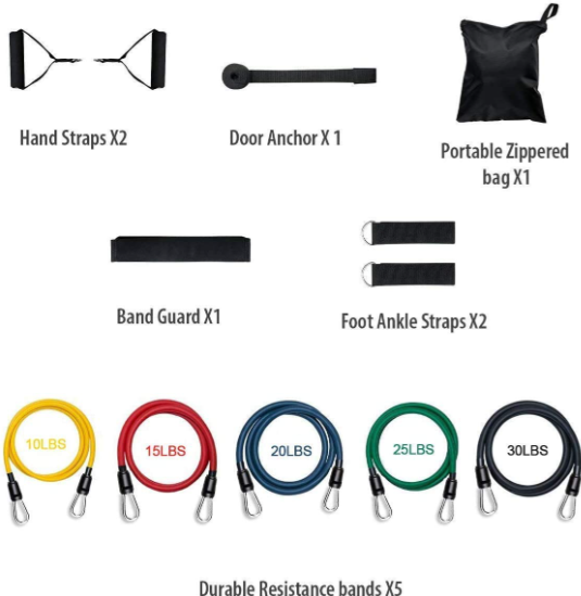 - Different Color Adjustable Resistance Bands: Yellow (10 lbs.), Blue (20 lbs.), Green (30 lbs.), Black (40 lbs.), Red(50 lbs.). All exercise bands are 48″ in length, and can be used alone stacked in any combination to a maximum equivalent of 150 lbs.